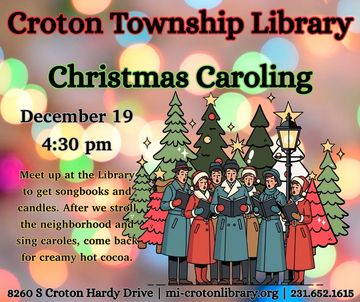4:30 pm Meet up at the library to carole through the neighborhood. When we're done, head back to the library for some yummy hot cocoa!