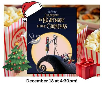 4:30 pm Have some popcorn with us and watch a classic, "The Nightmare Before Christmas". Call or stop at the circulation desk for details.