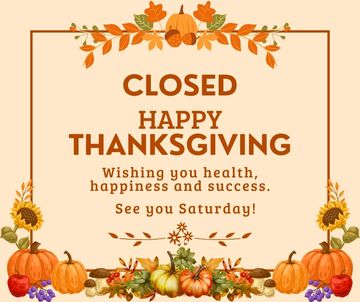 ALL DAY Happy Thanksgiving! Enjoy your family traditions. See you Saturday!
