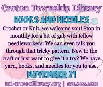 5:00 pm Knit or crochet; bring your own or use our materials. Whether you've mastered the fiber arts or you're brand new, we want you to join us and learn from each other.