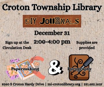 2:00-4:00 pm From the paper to the cover, make a journal that is yours. Paper making is returning along with some pyrography and paint. Sign up at the Circulation Desk.