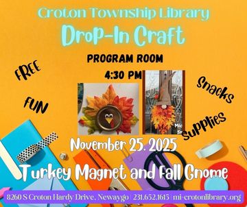 4:30 pm I'm thankful for Thanksgiving, and doing drop-in crafts with all of you. Supplies and snacks are provided.