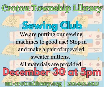 5:00 pm Join us for some fun with fabric! We are sewing upcycled sweater mittens. All materials are provided. Sign up at the Circulation Desk.
