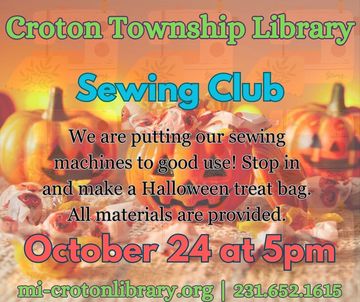 5:00 pm Join us for some fun with fabric! We are sewing our own treat bags. All materials are provided. Sign up at the Circulation Desk.