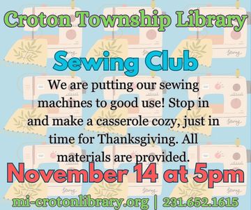 5:00 pm Join us for some fun with fabric! We are sewing casserole cozies. All materials are provided. Sign up at the Circulation Desk.