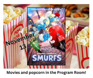 4:30 pm Have some popcorn with us and watch new release, "Smurfs". Call or stop at the circulation desk for details.